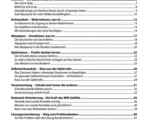 Aus der Blog-Reihe entstand ein 48-seitiges Buch, als pdf, gut lesbar am Tablet oder PC. Es ist kein Erfahrungsbericht über Krankheit, sondern es veranschaulicht die Einsatz-Möglichkeiten von Resilienz in zahlreichen herausfordernden Situationen des Lebens. Es gibt Einblicke, welche Herausforderungen unsere heutige Welt an uns stellt. Zudem beschreibt es in lebendiger Form, kurz und kompakt, die acht Bausteine der Resilienz, gepaart mit Erfahrungsberichten und kleinen Übungen.